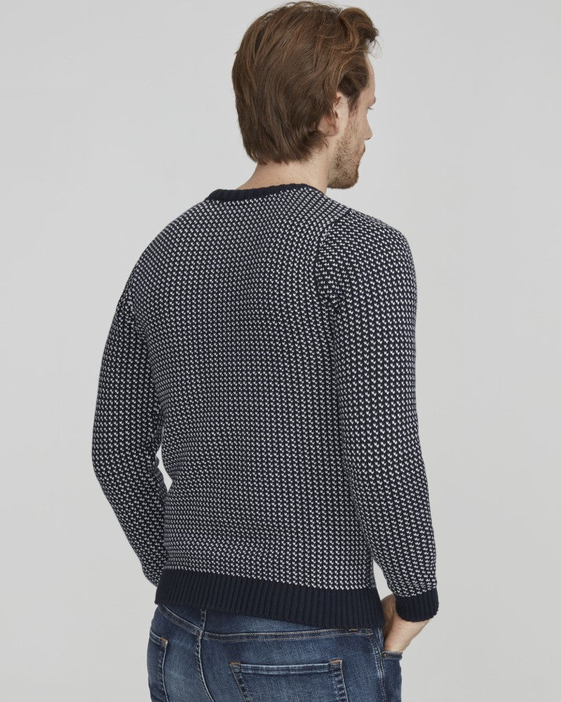 Traditional and classic jaquard knitted crewneck in cotton. Old fisherman pattern and contrasting endings. True one classic sweater to wear forever.